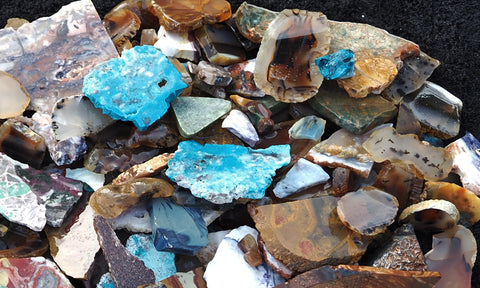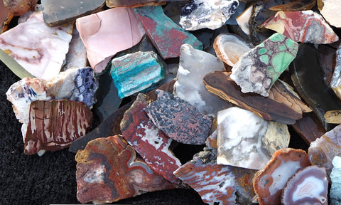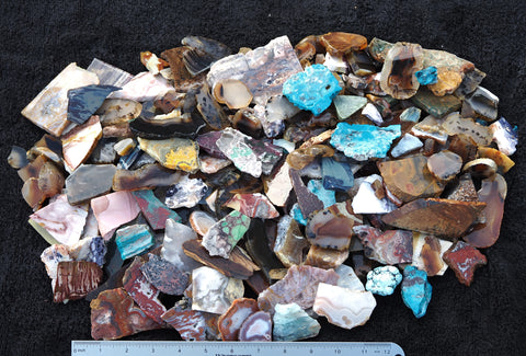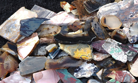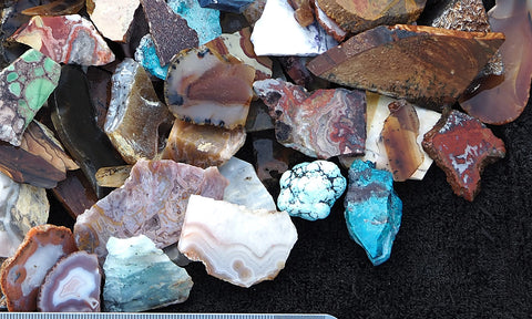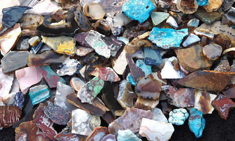 Money saving bulk tumbling and small cab mix.  This 10+ pound bag of lapidary material includes a large variety of agate and jasper pieces suitable for tumbling and or small cabochons.  The pieces are seconds that did not pass quality standards for solo store listings.  They include small slabs, end cuts, pieces with fractures or pits, thin or tapered cuts, and an occasional miscut chunk.  Each collection promises a kaleidoscope of colored and patterned usable lapidary material.