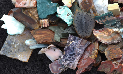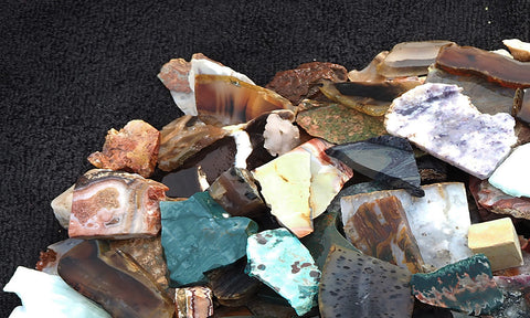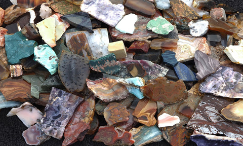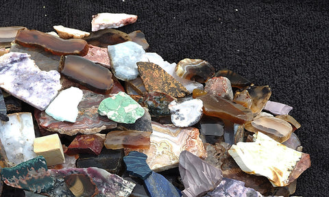 Money saving bulk tumbling and small cab mix.  This 10+ pound bag of lapidary material includes a large variety of agate and jasper pieces suitable for tumbling and or small cabochons.  The pieces are seconds that did not pass quality standards for solo store listings.  They include small slabs, end cuts, pieces with fractures or pits, thin or tapered cuts, and an occasional miscut chunk.  Each collection promises a kaleidoscope of colored and patterned usable lapidary material.