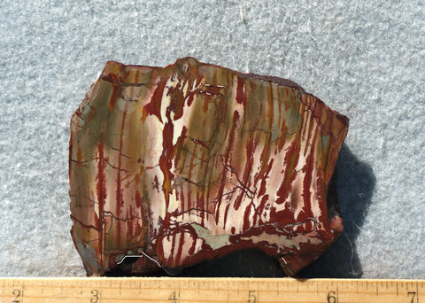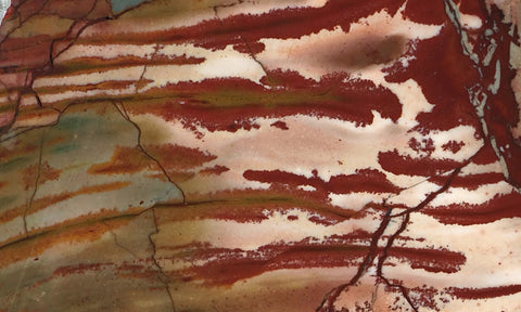 Dead Camel jasper from Nevada is a relative newcomer to the lapidary scene, but it has rapidly grown to be one of the current favorites. It's a very hard jasper, with busy, brecciated patterns in a mix of pink, yellow and blue. Excellent material to work with, it take a very glossy polish and makes one of a kind cabs.