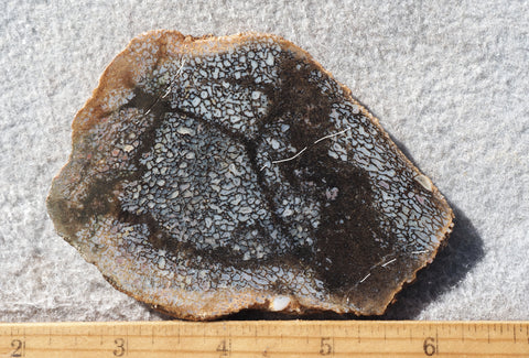 Dinobone, or petrified dinosaur bone, is one of the most rare and beautiful fossils in the world. It is the fossil of an animal bone containing minerals such as chlorite, chromium, iron-oxide and manganese that were deposited in the cells as it was formed. These different minerals create the varied colors and unique patterns found in the gem bones.  Black webbing in the cells is particularly beautiful due to the way it creates a contrasting difference from the yellow, orange, pink or red colors. Other colors that may be found in Gem Bone are brown, white, blue, green or gray. This is a great specimen that will  take a high polish and make truly unique cabs for jewelry!