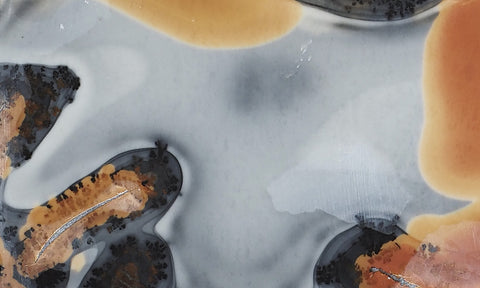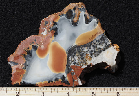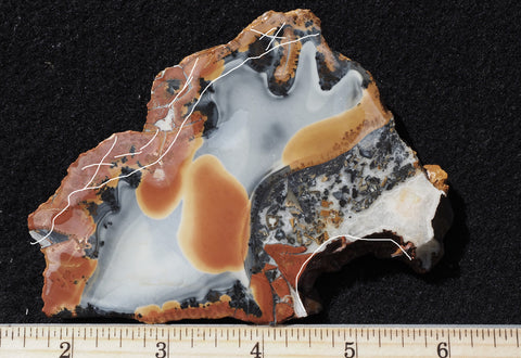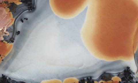 Maligano Jasper from Indonesia made its appearance to the lapidary market about a year ago. A very unusual brecciated jasper in shades of oranges, blues and gray showcases distinctive jasper scenes and occasionally includes a field of dendrites. The material may have some pits and healed fractures but the effort involved in isolating a splendid scene for a cabochon is well worth the effort.