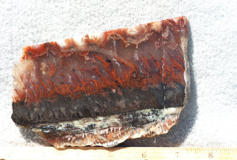 This semiprecious gemstone cabochon material is so named because of the characteristic flame inclusions found within the agate. Typical material displays brilliant red and orange flames that make fantastic collector’s slabs or showpiece cabochons for distinctive jewelry pieces. The material and finished pieces will take a beautiful polish.