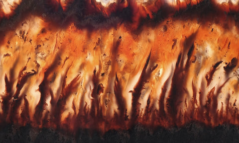 This semiprecious gemstone cabochon material is so named because of the characteristic flame inclusions found within the agate. Typical material displays brilliant red and orange flames that make fantastic collector’s slabs or showpiece cabochons for distinctive jewelry pieces. The material and finished pieces will take a beautiful polish.