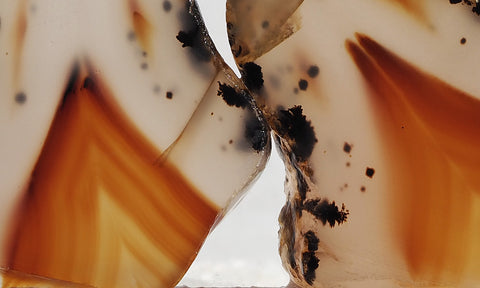 Montana agate has been a long time favorite of the lapidary enthusiast. Found in the alluvial gravels of the Yellowstone River in eastern Montana it has been collected and worked as a semiprecious stone for nearly a century. Noted for its clarity as well as its characteristic isolated black, and occasionally bright red dendrites, it makes excellent cabbing material. The majority of Montana agate pieces show a well-defined fortification pattern of black and brown as well as bright red/orange. There are also variations of filament and tube patterns and a small percentage display an “iris” band in which minute, regularly spaced layers act as a diffusion grating and, like a prism, break light into a rainbow of color. It is a relatively easy material to work with, being quite hard, and takes a brilliant polish.