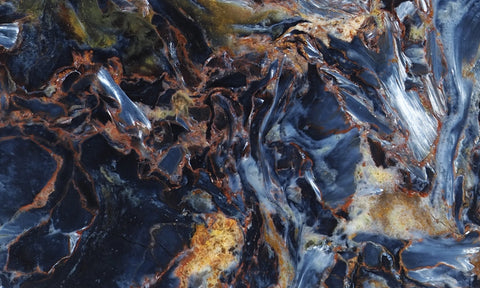 Pietersite is a very popular stone from Africa, noted for its brilliant chatoyant patterns of lightning blue/black and occasionally red/gold. Highly sought by the lapidary enthusiast, it produces spectacular finished pieces with great brilliance and flash. It is a hard silica material that has been formed by a rare geological replacement process, and is only found in quantity at 3 locations in the world.