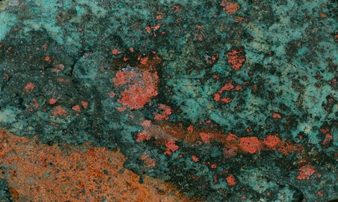 Sonora Sunrise is a highly desirable tri-color jasper out of Mexico. It is made up of Chrysocolla, which is a beautiful blue/green, and Cuprite, which is the red/orange interspersed with black iron banding. The contrast of these bold colors produces striking cabochons and is a mainstay for southwestern themed jewelry. Once plentiful, this material is increasingly difficult to obtain, especially slabs that display all three colors.