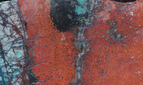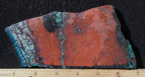 Sonora Sunrise is a highly desirable tri-color jasper out of Mexico. It is made up of Chrysocolla, which is a beautiful blue/green, and Cuprite, which is the red/orange interspersed with black iron banding. The contrast of these bold colors produces striking cabochons and is a mainstay for southwestern themed jewelry. Once plentiful, this material is increasingly difficult to obtain, especially slabs that display all three colors.