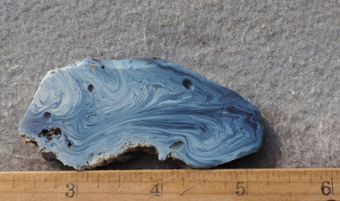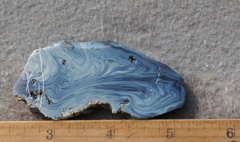 Superior Swirl/Pioneer Swirl slag glass is a very unique lapidary material, from upper peninsula of Michigan, which displays a subtle play of swirling patterns in multiple shades of blue. It is technically a glassy slag left from a copper smelting mining process that was active throughout the 1800 – 1900”s. There are multiple collecting sites for similar material; Leeland Blue from the lower peninsula, Sieber Agate from Germany, and Swedish Blue. It characteristically contains numerous pinhead sized vesicles and works up much the same as obsidian. It produces distinctive cabs ideal for that “special” finished piece.