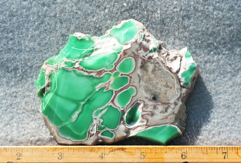 Variscite is a relatively rare aluminum phosphate mineral closely related to turquoise in its chemical composition. This material from Utah is noted for its glowing green color, varying in intensity from a light, mint green to a vibrant Kelly green often "webbed" in a gray matrix. Although softer than agate or jasper (somewhere around 5 on the Moh's scale) it takes a great polish and makes wonderful finished pieces.