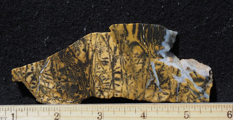 Yellow feather is a multi-color jasper found in Utah. The name "yellow feather" was inspired by the dark brown/black feather-like markings or manganese dendrites that cut across a colorful jasper background. The background colors vary due to iron inclusions, but they usually range in shades of yellow, orange, and tan. This material will make very picturesque and beautiful cabochons.